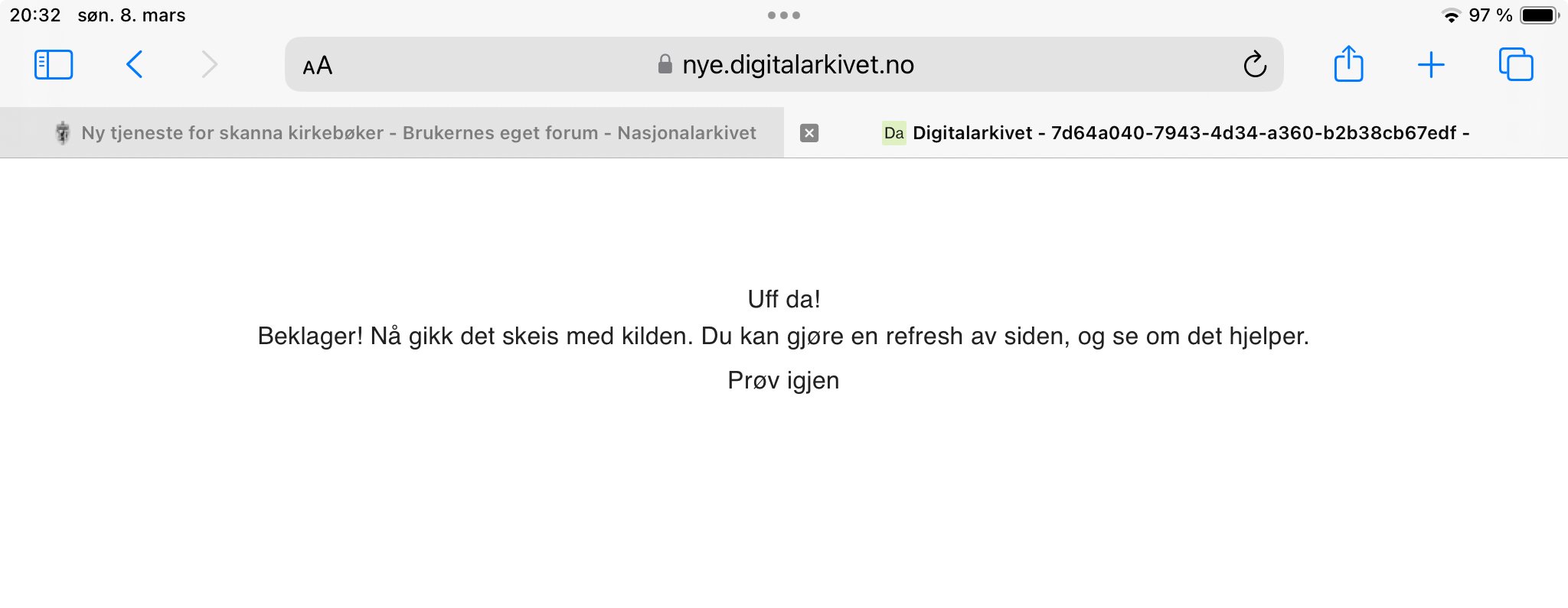 Kommer ikke inn på kirkebøkene ….. får opp denne feilmeldingen……usj… (bruker iPad og har alltid brukt den) -