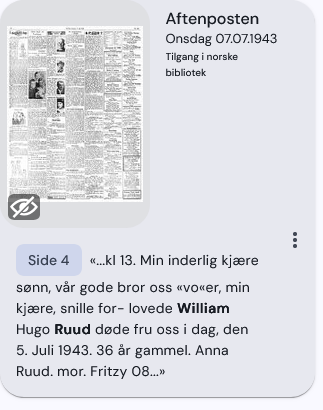 https://www.nb.no/items/2d9ef44600279c429ddad5798e9ede8f?page=9 https://www.nb.no/search?q="william hugo ruud"&mediatype=aviser&fromDate=19430705&toDate=19430715 Anna Fritzy død: https://www.digitalarkivet.no/view/387/pc00000003567260 -