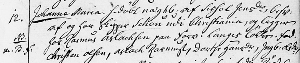 I Aker kirkebok er Johanne Maria døpt 12. juli 1795. Mor: Sissel Jensdatter Far: skipper Schou udi Christiania. Hun kaller seg Nilsdatter og Nicolaisdatter senere så hvilken Nils Schau i Kristiania. Noen som vet. Gift 20. januar 1822 i Nittedal med Husmann Kristoffer Jensen Ramstadhagen, født 1795 på Fletstein i Skedmo. Død 1882. https://media.digitalarkivet.no/view/7683/95 innflytta til Nittedal. 1818: «Johanne Nicolaisdatter, 26 år, Tjenestepige paa Søndre Holm, fra Aggers sogn, forevist attest fra slotsprest Munch af 6te Mai 1820 som beuiser at hun for 6 Aar sidenn hafde forladt Aggers sogen». Mvh. Torbjørn. Folketelling 1801.