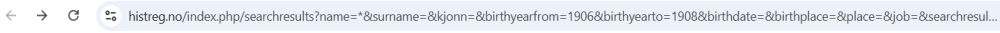 Ser at URL fra resultatet av et søk nå er forandret fra: til: Det ligger sikkert gode intensjoner bak dette. Men det gis oss som brukere problemer. F. eks. blir det nå umulig å sende resultatet av et søk til andre. I stedet må vi nå nitidig forklare hvordan hvert enkelt felt skal fylles ut for å få det samme resultatet. Det blir også umulig å ta vare på et søk og gjenbruke det uten å bygge opp hele søket på nytt. Jeg pleier å bruke det samme søket i flere uker frem til jeg har ryddet opp i alle profilene i dette søket. Ikke en kjempejobb å bygge opp akkurat dette søket på nytt, men for andre søk kan det være et problem, eller lett å glemme. - Today