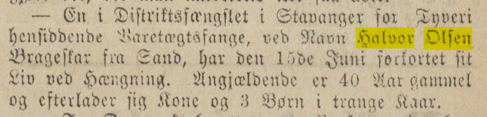 Kanskje i Stavanger, ikkje i Bergen, Fjordenes Blad, onsdag 28. juni 1876: https://www.nb.no/items/886490da5a5d4ad0d60c85a338a3c99f?page=1&searchText="halvor olsen "~2 Gardsnamnet skal vera Brageskar Her i dødsfallsregister (eg har ikkje slått opp i stavangerske kyrkjebøker), venstre side: Stavanger byfogd, AV/SAST-A-101408/001/5/52/52B/L0002: Liste over anmeldte dødsfall, 1863-1877, s. 133 Brukslenke for sidevisning: https://www.digitalarkivet.no/sk10511304101136 Han er frå Sand, men fødd i Suldal, i følgje folketeljinga 1865.. -
