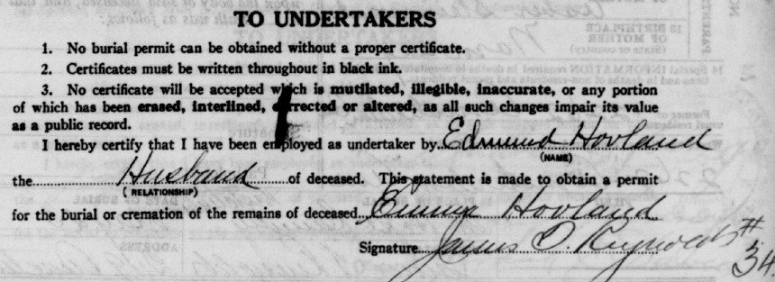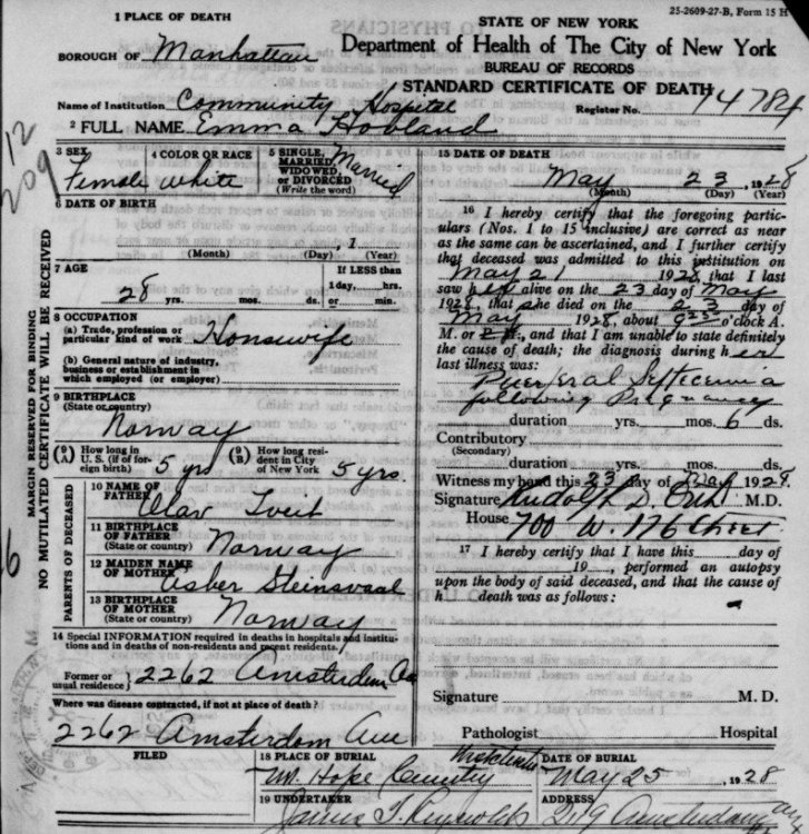 New York, New York City Municipal Deaths, 1795-1949 - https://www.familysearch.org/ark:/61903/1:1:24M9-RJJ?lang=en&cid=fs_copy Name: Emma Hovland Sex: Female Age: 28 Birth Year (Estimated): 1900 Birthplace: Norway Burial Date: 25 May 1928 Marital Status: Married Occupation: Housewife Race: White Event Type: Death Event Date: 23 May 1928 Event Place: Manhattan, New York City, New York, United States Event Place (Original): Manhattan, New York, New York, United States Certificate Number: cn 14784 Household Role Sex Age Birthplace Asber Steinsvaal Mother F Norway Olav Tveit Father M Norway Edmund Hovland -