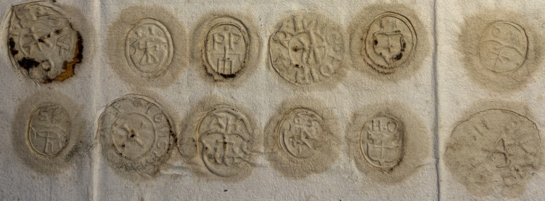 Jeg har fått svar og scan fra Nasjonalarkivet!🙌 Noen som vil forsøke seg på å tyde dette seglet? Det er så vidt jeg kan forstå seglet til Hågen Bø fra 1594. Seglene i nederste rad kan ikke være satt i rett rekkefølge, og det er noen til jeg ikke greier å tyde første initial på, men det kan se ut som om første rad er i rett rekkefølge i forhold til navnene som er listet i dokumentet. I så fall er dette Hågens segl og jeg greier ikke få så mye ut av det. Det er uansett ikke samme segl som i 1610. - Today