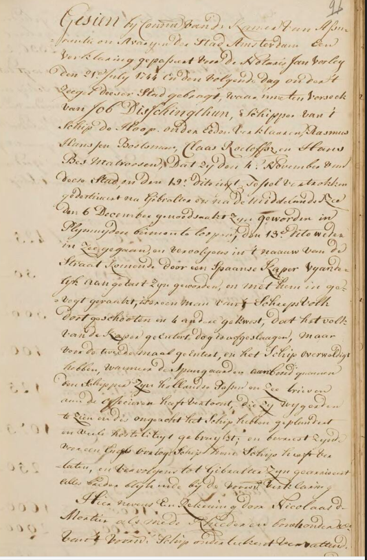 Dette er vel samme Job Dischingthon som utredet over. Spennende historie Dette er et notarialdokument, nærmere bestemt en sjøforklaring eller havarirapport (Verklaring), behandlet av "Kamer van Assurantie en Avaryen" (Kammeret for forsikring og havari) i Amsterdam. Dokumentet beskriver en dramatisk hendelse der det nederlandske skipet "de Hoop", under kaptein Job Disschingthun, ble angrepet og bordet av en spansk kaper (sjørøver/kaperskip) i Gibraltarstredet. Rapporten nevner at én mann ble skutt og drept, og fire andre ble skadet under kampen. Spanjolene plyndret skipet til tross for at kapteinen viste gyldige nederlandske papirer, men de flyktet da et engelsk krigsskip nærmet seg. Slike dokumenter var avgjørende for å kreve forsikringsoppgjør for tapte varer og skader på skipet. Det gir et fascinerende innblikk i farene ved sjøfart på 1700-tallet, spesielt trusselen fra kapere i Middelhavet. Detaljer nevnt Job Disschingthun: Rolle: Hovedperson, kaptein (Schipper) på skipet "de Hoop". Biografiske detaljer: Han ba om en formell erklæring angående kapringen av skipet hans. Han viste frem sine nederlandske pass og sjøbrev til de spanske kaprerne. Rasmus Hanssen: Rolle: Vitne/Deklarant. Biografiske detaljer: Båtsmann (Bootsman) på skipet "de Hoop". Avla ed på hendelsesforløpet. Claas Roeloffsz: Rolle: Vitne/Deklarant. Biografiske detaljer: Matros (Matroos) på skipet "de Hoop". Avla ed. Hans Bes: Rolle: Vitne/Deklarant. Biografiske detaljer: Matros (Matroos) på skipet "de Hoop". Avla ed. Jan Verley: Rolle: Notarius publicus i Amsterdam. Biografiske detaljer: Mottok og registrerte erklæringen 21. juli 1744. Nicolaas de Mortier: Rolle: Medreder og bokholder for skipet "de Hoop". Biografiske detaljer: Signerte et regnskap som var vedlagt erklæringen. Oversettelse ved hjelp av Scrabe AL, så ett lite forbehold: -