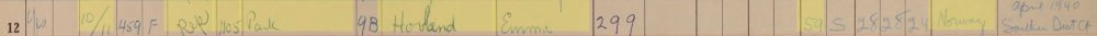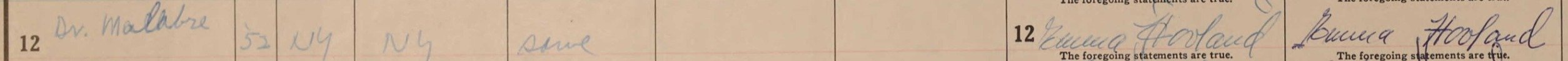 Finner henne i census 1950, var i tjeneste hos Dr. Mallaber (Malabre) United States, Census, 1950 - https://www.familysearch.org/ark:/61903/1:1:6XTY-7SFL?lang=en&cid=fs_copy Name: Emma Hovland Sex: Female Age: 52 years Birth Year (Estimated): 1898 Birthplace: Norway Marital Status: Single Occupation: Housekeeper Industry: Domestic Service Race: White Citizenship Status: yes Relationship to Head of Household: maid Event Date: 7 April 1950 Event Place: Manhattan, New York City, New York, United States (Manhattan, New York City, New York, United States) Enumeration District: 31-1302 Line Number: 21 Page Number: 74 Household Role Sex Age Birthplace Alfred L Mallaber M 65 years Jamaica -