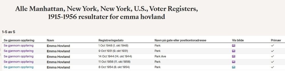 Finner henne i samme kilde (Manhattan, New York, New York, U.S., Voter Registers, 1915-1956) på samme adresse 1105, Park Avenue, Manhatten, NY i følgende år (se bilde under). Samme adresse som oppgitt i Naturaliserngssøknaden og census 1950. - Today