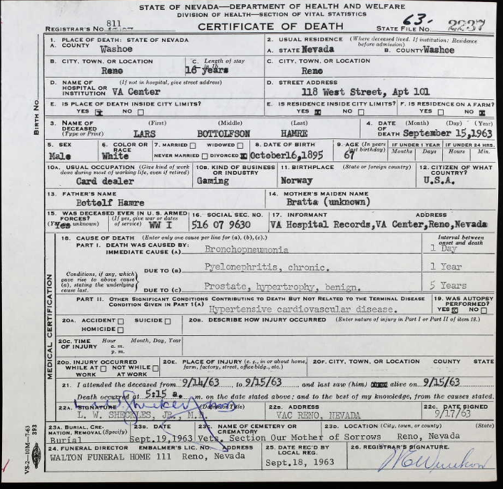 Dette kan være vår Judith Marie: Denne damen går igjen med ulike etternavn på Ancesty. I et familietre er hun oppført gift totalt 4 ganger, det første ekteskapet med John C. Ostrom. Men er det rett dame? Jeg finner en annen med samme navn, født i 1937: Minnesota, U.S., Birth Index, 1935-2004 - Ancestry.com Detail Source Name Judith Marie Hartman Birth Date 2 Jan 1937 Birth Place Nobles, Minnesota, USA Birth Registration Date 1937 Father Lorenza Merton Hartman Mother Laura Hartman File Number 1937-Mn-014394 Jeg ville vært forsiktig med å trekke konklusjoner her før dette er bedre undersøkt. -