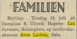 Lea Juvonen ble gift med Arne Løchen 10. juli 1951 i Oslo. Hun var født i Helsingsfors 10. august 1917, og jeg sliter med å finne hennes opphav i Finland.