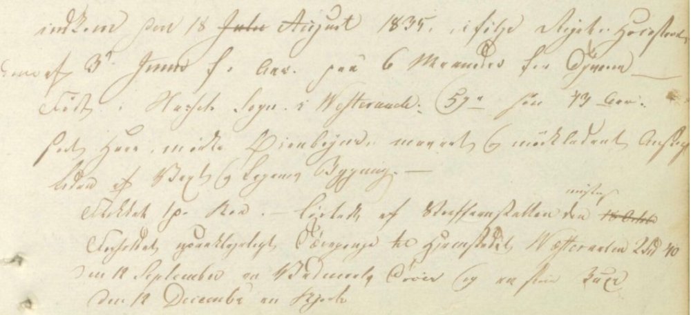 Et mangelfullt forsøk: indkom den 18 %Julii% August 1835, i følge Rigets Høiesterets- dom af 3 Junii f: Aar paa 6 Maaneder for Tyverie - Født i Hassels Sogn i Wæsteraalen 59[?] “ [tommer] høi 43 Aar sort Haar, mørke Øienbryne, mavert og mørkladent Ansigt liden af Vext og Legems Bygning. - Flikket[?] 1p. Skoe[?]. Løsladt af Straffeanstalten den [??] %18 Octob% Forholdet upaaklageligt. Tærepenge til Hjemstedet Wæsteraalen 2 Spd 40 den 12 September en Vadmeels Trøie og en [??] Buxe den 12 Decembr en Skjorte Mvh -