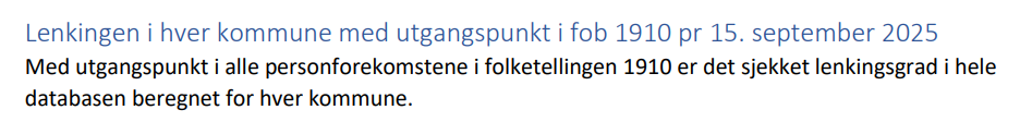 Som jeg skriver i et av de foregående innleggene, vil "brukslenke for sidevisning" på den formen som har vært i bruk sien 2015, fortsatt fungere. At den får en litt annerledes utforming i fortsettelsen, påvirker ikke de nettadressene som du og andre har registrert gjennom årene. Dette er et legitimt spørsmål, men det ble tatt i bruk et nytt design til tjenesten for digitaliserte fotografier og til tjenesten for dokumentsøk, og tjenesten for kirkebøker følger opp dette. Den gamle tjenesten for skanna kirkebøker har ikke kommuner i søkemenyen i det hele tatt, kun fylke, prestegjeld og sokn. Både fylke (som en del av geografifeltet), prestegjeld og sokn er videreført, så dagens kommuner er bare et tillegg, som noen kanskje vil foretrekke. Dessuten går det an å søke på gamle kommuner i geografifeltet. Når du velger fylket, er det naturlig at alle kommuner i fylket blir valgt. Men hvis du ekspanderer fylket, kan du velge én eller flere enkeltkommuner. -
