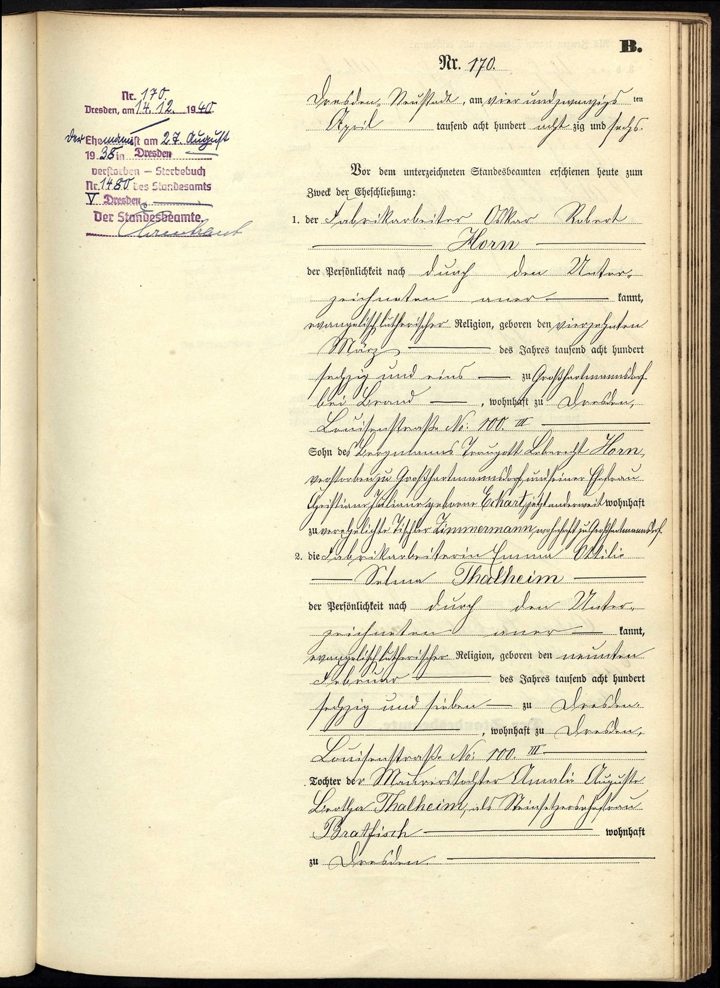 Han var født 14. mars 1861. Giftet seg 24. april 1886 med Emma Ottilie Selma Thalheim Far: Traugott Leberecht Horn Mor: Christiane Juliane Echardt (?) Dresden, Germany, Marriages, 1876-1927 - Ancestry.no