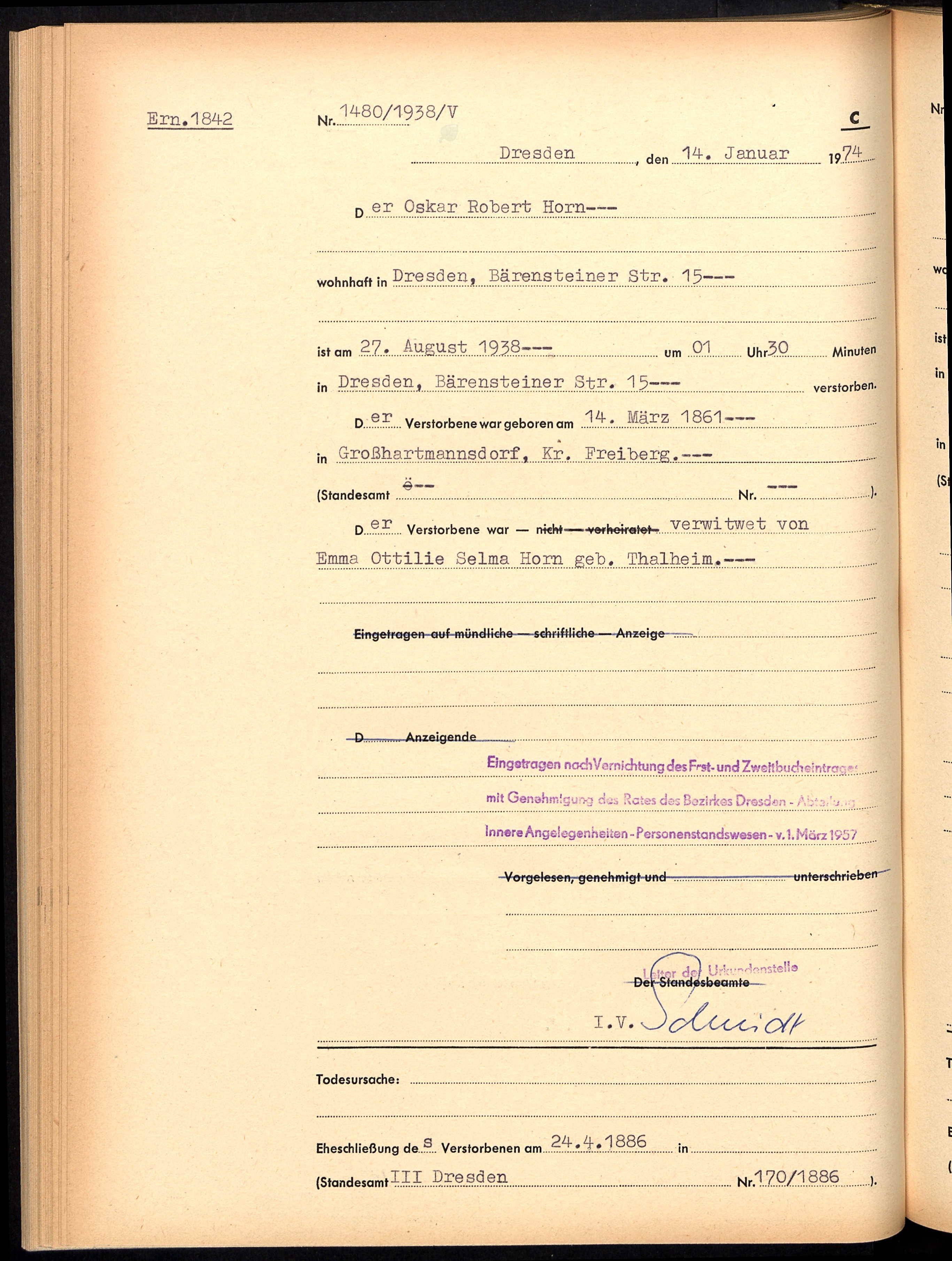 Oscar Robert døde 27. august 1938. Jeg ser ingen tittel i dødsattesten hans: Ancestry.com - Dresden, Germany, Deaths, 1876-1957