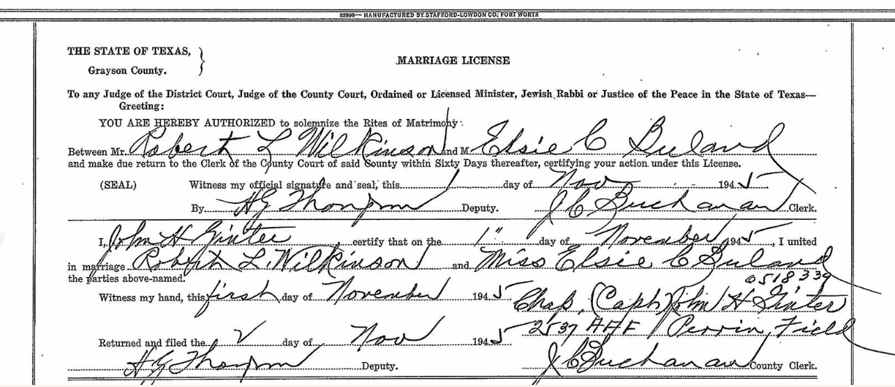 Texas, U.S., Select County Marriage Records, 1837-1965 - Ancestry.com Detail Source Name Elsie C Buland Gender Female License Place Grayson, Texas, USA Marriage Date 1 Nov 1945 Marriage Place Texas, USA Spouse Robert L Wilkinson