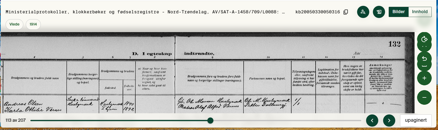 Fint bilde? Bildet er forholdsvis lavt da jeg har delt skjermen i to for å ha plass til en tekstfil nedenfor for å skrive inn opplysninger jeg finner. Dette medfører følgende utfordringer: Øvre linje viser at dette er et bilde fra enten en ministerialbok, en klokkerbok eller et fødselsregister fra Nord-Trøndelag og at bilde har en bildeID som kan kopieres. Neste linje viser at dette er viede i 1914. Så langt greit, men hvilken bok og fra hvilken kirke eller hvilket sogn står det ingenting om. For å sjekke hvilken bok det er snakk om, eller å finne linker til bildet, må en da lage vinduet mye høyere for å finne riktig ikon. Deretter må en gå tilbake til det minimerte bilde og sjekke der. Det fungerer , men er veldig knotete. Forslag til forbedring: 1. Gjør den venstre delen av første linje skrollbar slik at en kan lese hele teksten. 2. Flytt alle ikonene til linje 2 slik at de alltid vil vises. 3. Legg til en infoknapp på linje 2 slik det var i den gamle løsningen og dropp hele vinduet med minimert bilde. 4. For å øke forståelsen for nye brukere bør teksten "Bilde" legges til før bildenumrene i nedre venstre hjørne og teksten side før sidenummerfeltet i nedre høre hjørne. Noe helt annet. På dette bilde er det også en feil da dette er side 132 mens sidenummerfeltet vise upaginert. -