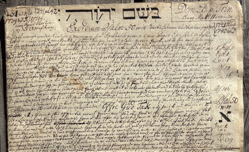 Eit nytt arvedokument frå skrivebordsskuffen: Fire tettskrevne ark som openbert er manuskriptet til ei preike, notat i dokumentet viser at presten har gjenbruka heile eller delar av manuskriptet i 1741 og 1742. Omfanget og kompleksiteten er strengt teke over mitt kompetansenivå, men eg vil gjerne utfordre meg sjølv for å sjå kor langt eg kjem. Eg må visst fyrst skaffe meg ein Bibel, tilvisingane er mange og det kan lette transkripsjonen. Spørsmålet mitt her gjeld derfor i denne omgang tilvisinga til "Lehman et Naschow pag. 198". Eg har søkt etter denne boka både på nettbiblioteket til Nasjonalbiblioteket og Google, utan klaff. Ho har tydelegvis vore eit hjelpemiddel for presten, så ho har eksistert. Ja, så var det skriftteikna øvst på ark 1 da, det er vel truleg hebraisk. Har me nokre teologar her? -