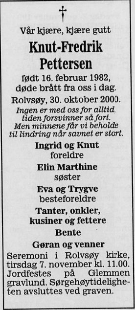 Kan noen hjelpe meg med å finne to dødsannonser? 1. Knut-Fredrik Pettersen - han omkom i en trafikkulykke i 2000. Har bare funnet minneord og om selve ulykken, men ikke dødsannonsen. Han var født i 1982. Vil tro at dødsannonsen skulle være å finne i Østfoldbyene. 2. Kapser Anton Enerud fra sande i Vestfold