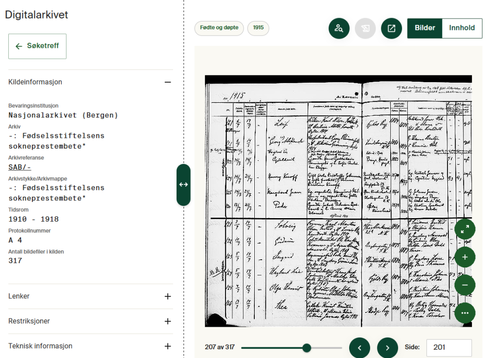 Må få ut litt mer frustrasjon ang den nye visningen, som jeg nok ALDRI kommer til å bli fornøyd med….siden den gamle har virket VELDIG bra og fortsatt gjør det! Jeg er nok litt negativ til nye ting, men kommer aldri til å skjønne poenget eller vitsen med å lage et nytt bildevisningssystem når det gamle var/er både BRA og fungerte/fungerer helt PERFEKT!. Er jo ikke noe vits i å ha noe nytt ”system” da?!. Har derfor prøvd å gjøre en grundig gjennomgang av noen forskjeller mellom den gamle og nye bildevisningen. Den gamle er UANSETT BEST!. (Kan ha glemt f.eks oversiktene over kirkebokinndelingen og annet ”småplukk”, men dette er det jeg har kommet over så langt) Jeg har ikke brukt mobilvisning noensinne siden jeg anser den for mer ubrukelig enn fra vanlig datamaskin. (Den nye bildevisningen er hvertfall ubrukelig i forhold til den gamle!). DESSVERRE er kirkebøker inkludert i den nye dårligere visningen. Men det ser heldigvis ut til at alle folketellinger fortsatt ER(?) i den gamle GODE visningen!. (Heldigvis, og det gjelder hvertfall skiftekort også!). Kirkebøker og andre ting burde ALDRI vært tatt inn i den nye visningen i det hele tatt. For å sammenligne har jeg basert meg på folketellinger fra den gamle GODE bildevisningen https://media.digitalarkivet.no/view/37001/671 , og basert meg på kirkebøker https://nye.digitalarkivet.no/source/1134/parish/24f9a266-e885-45cb-854b-8208d79bc363 fra den nye DÅRLIGERE visningen. 1 Jeg har benyttet F11 for å gjøre siden til fullskjerm, dette kan gjøres i begge ”visninger”, men den gamle visningen er MEST optimal. Gamle visningen gir BEST oversikt. 2 De 2 visningene er totalt forskjellige, noe som gjør ALT mer forvirrende, og det er også andre ikoner i den nye DÅRLIGE visningen enn det er i den gamle GODE visningen. 3 Den gamle GODE visningen er veldig oversiktlig i forhold til den andre ”visningen”. Øverst i den gamle visningen får man oversikt over hvor kirkeboksiden er å finne inkl bilde-ID, og under der hvilken folketelling det er og fra hvor og når. VELDIG greit og lettvint!!. 4 I den nye DÅRLIGERE visningen derimot er det øverst viet totalt unødvendig stor plass til info om kirkeboka etc og også ”Lenker”, ”Restriksjoner” og ”Teknisk informasjon” og disse tar også FOR STOR plass på siden øverst der, og enda har man ikke kommet ned til selve kirkeboksiden engang!. DÅRLIG!. 4a Den gamle GODE visningen av selve kirkeboka er VELDIG grei i forhold til den andre ”visningen”!. I denne visningen er det flere ikoner rett over selve kirkeboka, f.eks det borterste (3 streker) som inkl husk zoom, posisjon og skjul oversiktskart, men også de andre ikonene der, spesiellt det med fullskjerm av og på, kopier til utklippstavle, og last ned. VELDIG lett å laste ned eller gjøre ALT i den gamle visningen. Det er jo også en knapp å klikke der som man kan gå til neste eller forrige side. VELDIG nyttig!. 4b Og når man bruker hjulet på musa i gamle visningen beveger man siden ned og opp og man kan bruke + og – tegnene til forstørring og forminskning av siden…helt YPPERLIG i forhold til den andre ”verre visningen”!! 5 Den nye DÅRLIGERE visningen derimot….. Over kirkeboka, ser man riktignok at det f.eks er døde og begravede og årstallet, men ikonene ved siden av er unødvendig store og FORSKJELLIGE fra den gamle GODE visningen, noe som gjør ting forvirrende. 6 Dessuten ligger ikonene i den nye DÅRLIGE visningen ”RUNDT” kirkeboka og IKKE over kirkeboka, slik som i den gamle GODE visningen. 7 Videre i den DÅRLIGE nye løsningen….hjelper det ikke bare å begynne å bruke ”musehjulet” slik som i den GODE gamle visningen….neida!....når jeg bruker ”musehjulet” i den nye DÅRLIGERE visningen beveger bare deler av siden seg og jeg kommer ikke nedover til selve kirkeboka om jeg ikke benytter ”musehjulet” på rette delen av siden(!). Virkelig irriterende!. 8 Angående ikoner i den nye DÅRLIGERE visningen så er jo noen selvsagt like som i den gamle (de 4 på SIDEN av selve kirkeboka, men de ikonene er STØRRE. 9 Og for hver eneste gang man bruker ”musehjulet” på den nye DÅRLIGE visningen så blir kirkeboksiden bare enten mindre eller større og det er MYE vanskeligere å manøvrere også siden man må gjøre det på rette delen av siden for å få det til i det hele tatt!. 10 Det går riktignok an å trykke F11 og så trykke ikonet for ”åpne fokusmodus” (kalt fullskjerm av/på i den gamle GODE visningen), men det er allikevel uansett MER tungvint å bruke den nye DÅRLIGERE bildevisningen enn den gamle pga alt sammen!....bl.a manøvreringen på den nye ”visningen”. 11 Og det å finne f.eks ”husk zoom”, posisjon eller ”skjul oversiktskart” i den nye DÅRLIGE visningen er jo en vitenskap i seg selv!!. UTROLIG TUNGVINT!. Bl.a disse er jo UTROLIG MYE lettere tilgjengelig i den gamle GODE visningen!!. 12 Det å laste ned i den nye DÅRLIGERE visningen er også en vitenskap å måtte finne ut av. MYE lettere å gjøre det i den gamle GODE versjonen siden den jo har en knapp å trykke på for å gjøre det og er MYE ryddigere også. 13 På grunn av alt tullet med denne nye DÅRLIGERE bildevisningen får man IKKE noe mer lyst til å se på noen som helst kirkebok noensinne igjen!!. Den nye DÅRLIGERE visningen ( https://nye.digitalarkivet.no/source/1134/parish/24f9a266-e885-45cb-854b-8208d79bc363 ) er rett å slett så å si nesten unavigerbar, forvirrende, tar opp mer plass på siden, mye mer komplisert og vanskelig å finne det man leter etter, og derfor totalt unødvendig hele den nye visningen (hvertfall for kirkebøker sin del). Unødvendig også spesiellt med tanke på at den gamle visningen fungerte helt fint og uten problemer, og har stortsett de samme mulighetene, men LETTERE å finne dem når man trenger dem!. Den gamle GODE visningen ( https://media.digitalarkivet.no/view/37001/671 ) derimot gir et VELDIG MYE mer ryddig bilde av både