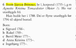Var Sigvart Meyer son av korporal Sven Sjursen Bremnes og Agnete Kristina Tomasdtr? Her er lenker til Sigvart i folketelling 1801 og Uhrmagerne i det gamle Christianssand Og Svend Bremnes i Gards- og ættesoge for Eidfjord: For å forklare korleis eg endte opp med dette: I Stavanger 15. november 1791 gifta Rakel Svendsdatter Bremnes og Sven Simonsen Grødem seg, og 12. februar 1799 Ingeborg Svendsdatter med Endre Edvartsen. Ingeborg gifta seg på ny i 1814 . Begge desse to er omtala i Stavanger borgerbok, då er begge kalle Sjursdatter, mens dei i kyrkjebøkene er kalla Svendsdøtre. Om Ingeborg står det: Sett vekk i frå at borgerboka har feil farsnamn så stemmer dette bra med Sven Bremnes. Alder stemmer og på både Rakel og Ingeborg. I 1802 døypte Sven Grødem og Rakel Svendsdatter ein son, der ein av fadderane var Bertel Meyer Svendsen. Dette tenkte eg kunne være bror av Rakel og Ingeborg, og at eg kanskje kunne finne han i 1801-tellinga. Det gjorde eg ikkje, men eg fann ein sjømann Bertel Meyer gift med Dorthe Villumsdatter Justnes i Kristiansand i 1803 der Sigvart Meyer var forlover. Bertel Meyer døydde nok kort tid etter, for Dorthee Meyer sel huset sitt i 1804, og seinere sel ho diverse frukt, grønnsaker og fjørkre I følge boka Uhrmagerne i det gamle Christiansand var Sigvart Meyer gift med Caroline Olsdatter Dahl (Ved dåpen til sonen, 29 sept. 1789 er ho kalla Caroline Clausine Olsdatter Dahl) og Inger Willumsdatter Justnes. Vigselen med Inger finn eg i Kristiansand, men ikkje den med Caroline. Men eg finn ein vigsel i Bergen i 1787 mellom urmakersvenn Sivert Svendsen og Caroline Olsdatter Dahl. (Dahl er ikkje transkribert, men står i orginalen, linje 2 til høgre). I tillegg finnes det ei Anna Christina Meyer i Kristiansand (født ca 1776, mot 1773 i bygdeboka til Eidfjord). Ho hadde og Sigvart Meyer som forlover ved den fyrste vigselen. Seinere blei ho gift to gonger til, i 1808 og 1814 Så kanskje er dette litt spekulativt, men Sigvart Meyer gifta seg (kanskje) fyrste gong i Bergen. Han var son av ein Sven, han hadde riktig alder og Meyer-namnet fantes i familien til Sven Bremnes. Kan det være mogleg å bevise eller motbevise at Sigvart var Svend Bremnes sin son? Og var Bertel og Anne Christine Meyer søsken av han? ---- Om foreldra har eg, i tillegg til det som står i bygdeboka, funne i Bergen: Vigsel i Bergen i 1762 mellom Svend Sivertsen Lind og Agnete Kirst. Tomædtr. (Var Sven Sivertsen Lind og Sven Sjursen Bremnes same person eller var ho gift to gonger?) Dåp i Bergen 1764 av Thomasia Margaretha foreldre: Svend Sivertsen Lind og Agnete Kirstine Thomædtr, ho er og nevnt på skiftekortet til Agnethe, men ikkje i bygdeboka. I 1801 kanskje på Bergenhus Dåp i Bergen i 1778: Christiane. Foreldre Svend Bremnes Under-Officier og Agnethe Kirstine Thomædatter. Står ikkje på skiftekortet Gravferd til Agnethe Kirstine Thomædatter i Bergen i 1782 Skiftekortet til Agnethe, Sven var framleis i live. -
