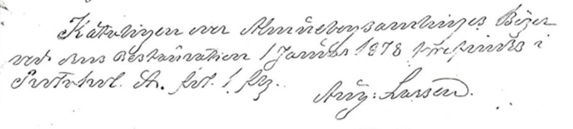Kan noen hjelpe meg å tyde? Jeg tror det står: "Katalogen over Almuebogsamlingens Bøger ved ... Restauration 1 Januar 1878 forefindes i Protokoll A. ført 1 ….? Aug. Larsen"