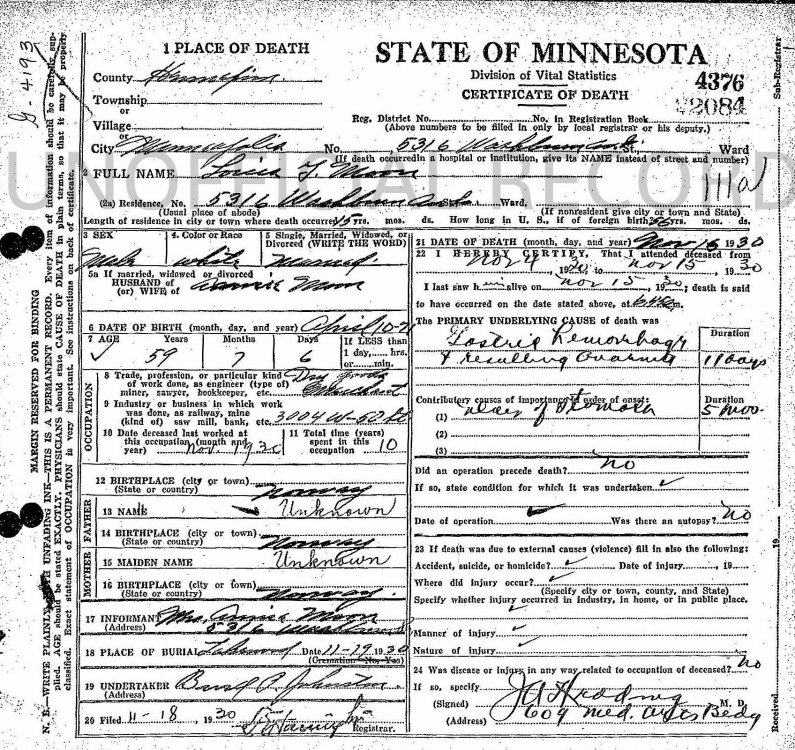 Eg har i mange år freista finna det norske opphavet til Louis T. Moon, som eg i dag har motteke ein kopi av dødsattesten til! Denne oppgjev han skal vera fødd i Noreg 10.4.1871, men foreldri hans er ukjende! Det står han hadde vore i Amerika i 56 år - dvs. utvandra i 1874! Her er han i * FT1900 med antyda fødselsdato i april 1869 (utan utvandringsår): https://www.familysearch.org/ark:/61903/3:1:S3HY-68F9-2BR * FT1920 med antyda fødselsår 1870 (49 år i jan. 1920) og utvandringsår 1873: https://www.familysearch.org/ark:/61903/3:1:33SQ-GRNR-S1Y Er det mogeleg utifrå desse opplysningane å finna ut: ** Fullt namn i Noreg? ** Dato og stad for fødsli hans? ** Utvandringsåret? ** Fulle namn på foreldri hans med yrke, bustad og opphav? Eg takkar so mykje på førehand for alle gode tips! -