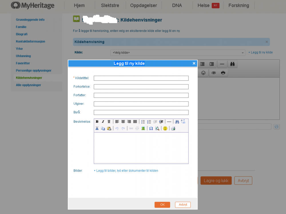 hei. Dette tema ligger muligens litt i grenseland i forumet, men handler om behandling av kilder innen slektsgranskning.(slett hvis ikke akseptabelt). Tenker rydde opp i kilder til profilene i stamtre da disse (hovedsaklig lenker) har blitti blitt lagt inn som opplysninger. Samtidig være sikker på at dette blir rett utført. Er det slik at man lager nye kildehenvendelser slik vedlagte bilde viser? Jeg har kilder til forskjellige anledninger: Fødsel, dåp, konfirmasjon......... for hver person i treet. Lager man ny kilde for hver av disse hendelser for hver person? Innformasjoner til "Legg til ny kilde" vindu synes best tilpasset tex. en bok. Hvilke system bruker dere for å holde styr på alle kildene? Etter at kilder er laget, er vinduet "Alle opplysninger" samt lenkene "legg til en ny kildehenvisning" er fulgt eneste måten å gi kildene tilhørighet til personens Fødsel, Barnedåp.......? mvh