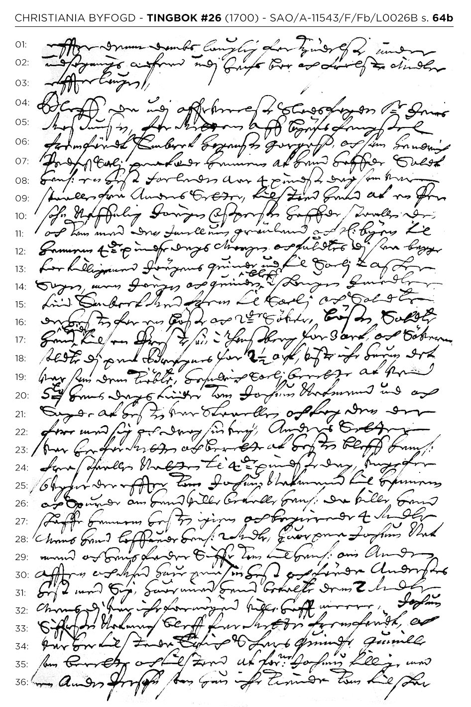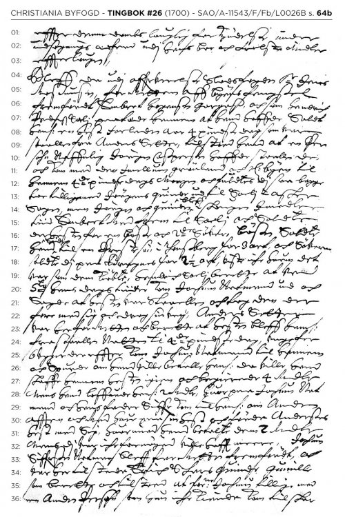 Hei alle sammen. Mitt navn er Karl Magnus og jeg er ny her. Jeg holder for tiden på med et skriveprosjekt med fokus på de "æreløse" i Norge rundt år 1700. I den forbindelse gjør jeg research på historien om forbryterhøvdingen Siver Svendsen og "Det sammenrottede Natmandshougpakk" som herjet i traktene rundt Kristiania i de siste fem årene av det sekstende århundre. Det meste av kildematerialet finnes i rettsdokumenter fra den tiden så jeg jobber nå med å lære meg å tyde gotisk håndskrift. Jeg har læreboken til Aud Mikkelsen Tretvik og Kjell Haarstad men det er vanskelig å finne den nøyaktige stilen som ble brukt i Kristiania rådstuerett og bytings protokoller. Jeg har funnet ut av hvilke sider i hvilke tingbøker som omhandler kriminalsaken rundt røverbanden på Nattmannshaugen men mine forsøk på tyding går tregt. Så nå henvender jeg meg til dere i håp om å få hjelp med å tyde bare et par paragrafer sånn at jeg kan bruke dette som nøkkel for å tyde resten av protokollen. Er det noen som føler seg kallet til å gi en nybegynner et stort løft? På forhånd tusen takk for enhver interesse. Jeg har lagt opp noen sider fra tingbøkene i en egen mal der jeg har etterbehandlet teksten så den er lettere å lese. 1: Christiania byfogd, SAO/A-11543/F/Fb/L0026B: Tingbok, 1700, s. 64b https://media.digitalarkivet.no/view/29178/67 2: Christiania byfogd, SAO/A-11543/F/Fb/L0026B: Tingbok, 1700, s. 69a https://media.digitalarkivet.no/view/29178/71 -