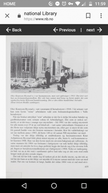 Hello, Would anybody have more information on Olav Knutsson Rysstad and his wife Jorunn Rysstad. Thanks to the Valle Kommune bygdeboker books Vol 1 & 2 there is some information on him and his forefathers going back to Nils Mikkelsson Nomeland (1570-1605) A few people on here have provided me with some census records which have been helpful. And even screenshotted pages from Valle Kommune of Olav's great grandfathers like Tarjei Knutsson Uppstad and Knut Tarjeisson Uppstad, etc. I understand that information is limited, missing or non-existent. Perhaps some of you are related and have details, photos, etc that you would be willing to share. I posted one of the few photos I have of Olav. Been reaching out to digitial archives and setesdal museum and others. But like mentioned before, information may be hard to come by. I was told to reach out to family in Vennesla. Any suggestions? Thanks