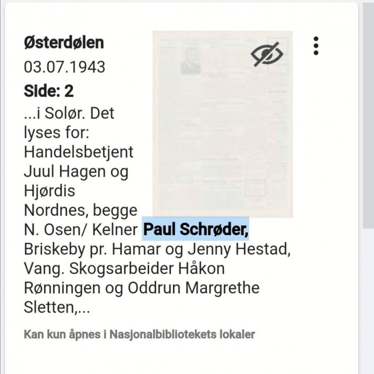 Tove Bodin Bratlie Skrevet August 20, 2011 Forfatter Del Skrevet August 20, 2011 Nå kanskje jeg missforsto litt. Jeg fant dette: Kildeinformasjon: Oslo fylke, Oslo Adressebok, Digitalisert bok , 1918-1918, oppb: Riksarkivet. Om adresseboken er fra 1918, så er det nok "min" Paul. Det er vel trolig at han flyttet til Hamar som lå under Vang Hedmark, da, eller? Har du noen aning om hvordan jeg skal finne ham der? Lenke til kommentar Del på andre sider More sharing options...