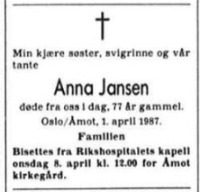 kan noen hjelpe med dødsannonse for:  Anna Karense Jansen, bodde Folke Bernadottes vei 5 a eller b, Kringsjå Oslo.