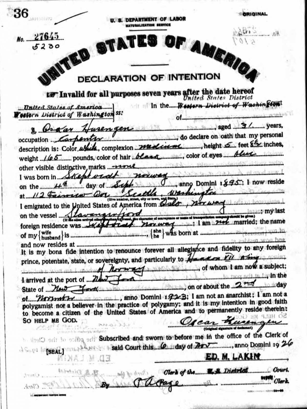 Oscar Johansen Husengen i Amerika 1923-1929. Hvor oppholdt han seg i Amerika i denne perioden?