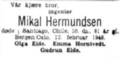 LØYST: Johan Michael Hermundsen, fødd i Bergen 1865 - utvandra før 1914 til Chile - levde framleis 1930 - biografi?