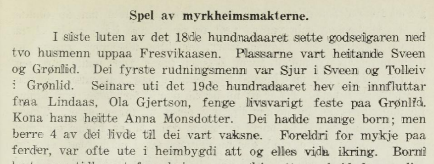 Elles ville det vore spennande om du har fleire opplysningar om etterkomarar etter Mons Pedersen Grønli. Systera hans, Mari, har eg ikkje funne etterkomarar etter.