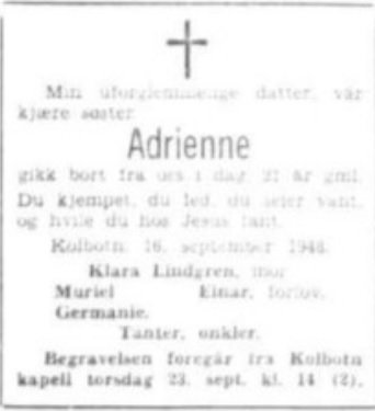 Adrienne Lindgren døde 16. september 1948 og ble gravlagt 23. september fra Kolbotn kapell, 21 år gammel.