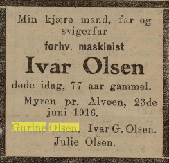 * Ivar Gunerius Olsen, f. Bergen 8.4.1881 – d. 27.5.1965 (Loddefjord) – gift Askøy 24.11.1912 med Julia Sofia Paulson – f. Alvøen 8.8.1880 – d. 7.7.1957 (Loddefjord))