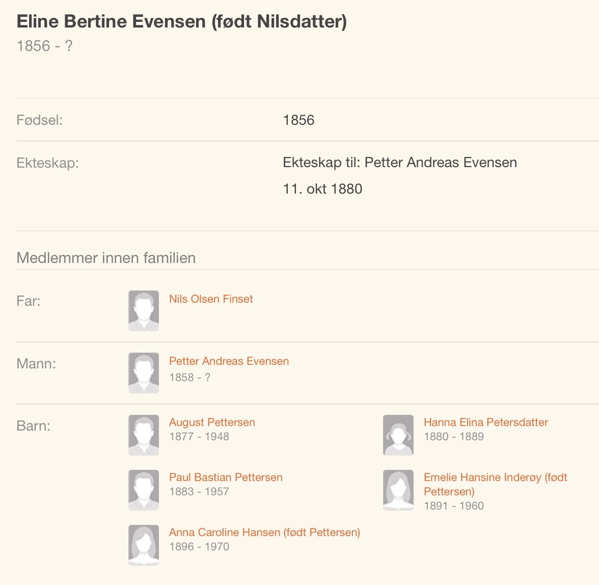 ( datteren Eline Bertine f. 1856 (el. 1854 ?) og hennes mann, Petter Andreas Evensen f. 1858, og deres barn har jeg opplysninger om ) - se vedlegg !