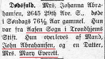 USA: ekteparet John og Johanne Abrahamsen f. ca 1845-1846 emigrantar frå Noreg - kven var dei?