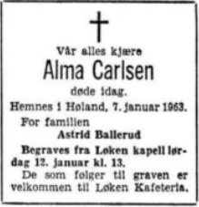 Jeg ble nysgjerrig på hvem Astrid Ballerud var (hun i dødsannonsen). Til slutt fant jeg ut at hun faktisk var datteren til Alma Charlotte.