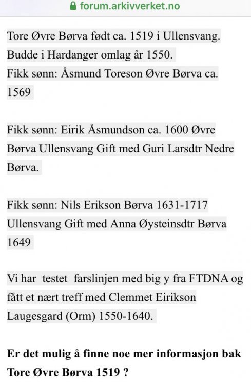 Vidar Rue Skrevet September 19, 2019 Del Skrevet September 19, 2019 (endret) De som hevder at Jon kommer i fra Laugesgard/Larsgard i Hovet tar høyst sannsynlig feil. Min Y-DNA er R1b L-238 en med navnet Onarheim finnes også bare i en annen gren. https://www.ytree.net/DisplayTree.php?blockID=189 Endret September 20, 2019 av Vidar Rue Lenke til kommentar https://forum.arkivverket.no/topic/229520-slekten-orm-p%C3%A5-stord/page/3/#findComment-2032975 Del på andre sider More sharing options...