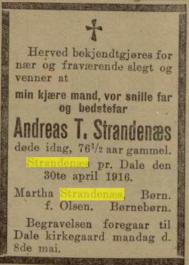 Ann-Mary Engum Skrevet November 27, 2019 Del Skrevet November 27, 2019 18 minutter siden, Torbjørn Igelkjøn skrev: Andreas har ein allereie funne, men eg limer inn dødsannonsen frå Bergens Tidende: https://www.nb.no/items/84f058afc9c69c503d11809ee911bd90?page=1&searchText="martha strandenæs"~2 https://www.nb.no/items/84f058afc9c69c503d11809ee911bd90?page=2&searchText=Strandenæs Torbjørn Igelkjøn reagerte på dette 1 Lenke til kommentar Del på andre sider More sharing options...