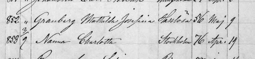 Fant henne! Uekte født i Adolf Fredriks forsamling under samme navn på samme dato som angitt i Husförhörslängden i Brännkyrka: