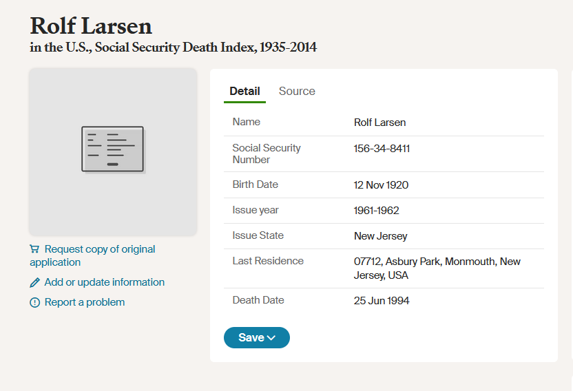 Det kan jo være tilfeldig navnelikhet, men det blir døpt et barn ved navn Rolv 1921 i Kristiansand med fødselsdato 12/11 1920. Foreldre oppgis til Hans Marius Larsen og hustru Bertine