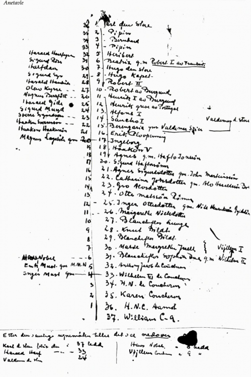 Elin Galtung Lihaug Skrevet Desember 29, 2020 Del Skrevet Desember 29, 2020 Det vanskeligste er nok å kildebelegge hvert ledd bakover til Ingerd Ottesdatter (Rømer) på Austråt (d. før 1555). Fra Ingerd Ottesdatter og bakover til Olav den Hellige (d. 1030) er det lettere. Videre bakover til Harald Hårfagre har man ingen sikre kilder. Peter S. Lunga hadde et innlegg på forumet i juni 2011 hvor han la frem kildebelegg for de 8 leddene bakover fra Ingerd Ottesdatter til Håkon V Magnusson: Lenke til kommentar Del på andre sider More sharing options...