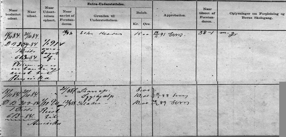 The first three columns: I don't quite understand the headings, but there are dates as well as other numbers (such as "309-84"), not to mention that the handwriting is not too easy to read. But the dates in 1891 (Alice) and 1890 (Jens) are after they both have returned to America in August 1890. The other columns, "Extra Support" and "Praise" (Approbation), I can't read the remarks. If someone can help me understand all these things, that would be wonderful.
