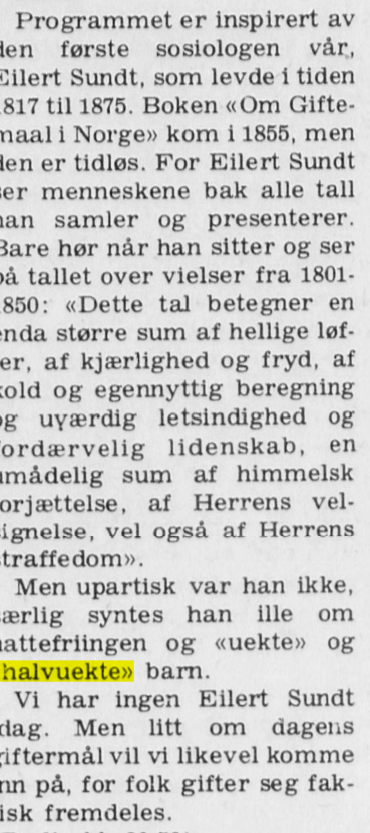 Ivar Moe Skrevet Mai 6 Del Skrevet Mai 6 (endret) Sosialogen Eilert Sundt hadde meninger om halvuekte på 1800 tallet? Kan det være han presten har "kopiert"? Gjengangeren, lørdag 3. august 1974 Endret Mai 6 av Ivar Moe Lenke til kommentar Del på andre sider More sharing options...