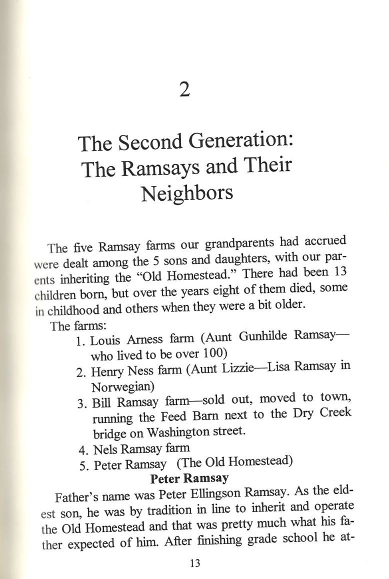 Egil Johannessen Skrevet 18 timer siden Del Skrevet 18 timer siden (endret) Nr. 4 Nels Ramsey farm Nils f. 1859: U.S., Evangelical Lutheran Church in America Church Records, 1781-1969 Name Nils Ramsø Baptism Age 0 Record Type Baptism Birth Date 22 Feb 1859 Baptism Date 1859 Baptism Place Decorah, Iowa, USA Father Elling O Ramsø Mother Aase Nilsdaughter Sjerpe Church Name Washington Prairie Church Location Decorah, Iowa Gift med Marit (Mary) Juulsdatter Kvale i 1885. FAG for begge: Nils - https://www.findagrave.com/memorial/197044108/nels_ellingsen-ramsey Marit (se også foreldre + barn listet hos FAG) - https://www.findagrave.com/memorial/197044296/marit_juulsdatter-ramsey OBIT for Nils: The Gazette, Cedar Rapids, Iowa, Saturday, 16 July 1938 Page: 3 Nels E. Ramsey, 79, died Friday at the Aase Haugen Home for the Aged where he had been a resident for several years. Mr. Ramsey had risen and started for the bathroom. Mistaking the door to the elevator shaft for the bathroom door, he opened it and stepped into the shaft, suffering injuries which caused his death. Mr. was born Feb. 22, 1859, Ramseym south of Decorah. His parents were Elling and Aase Ramsey, among the earliest of the Norwegian pioneers of Winneshiek county. He was married May 28, 1885, to Marit Kvale, a daughter of Mr. and Mrs. J. Kvale, another pioneer couple. During the greater part of his life Mr. Ramsey engaged in farming. Surviving are his wife and three adopted, children, Mrs. Amelia Berg, John Ramsey and Mrs. Roy Halvorson, all of Decorah. He is also by three sisters, Mrs. Henry Prastmark of Detroit Lakes, Minn. Funeral services will be held Monday ate the Washington Prairie Lutheran church. Endret 17 timer siden av Egil Johannessen Lenke til kommentar Del på andre sider More sharing options...