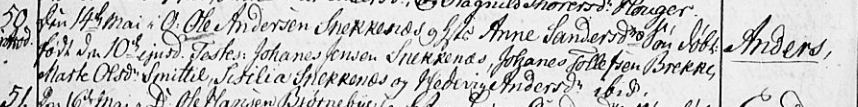 • 01.08.1813: Ole døpt. Foreldre innført som Anders Olsen & Anne S. (åpenbart navnebytte i kirkeboka); faddere fra Snækkenes/Brekke.