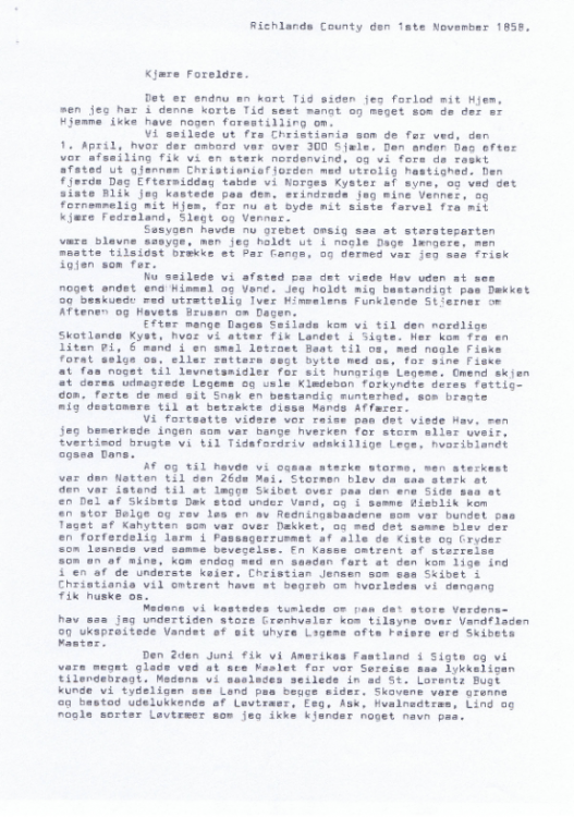 SIDE 1 . BREV FRA TOLLEF OLSEN NORDHOUGEN TIL SIN MOR OG MIN STAMMOR ; KAREN THOMESDATTER OG HENNES EKTEMANN I HENNES ANDRE EKTESKAP MED OLE JENSEN NORDHOUGEN I LISMARKA DATERT 1 NOVEMBER 1858 . MASKINAVSKRIFT AV ORGINALEN CA 1930 – 40 .