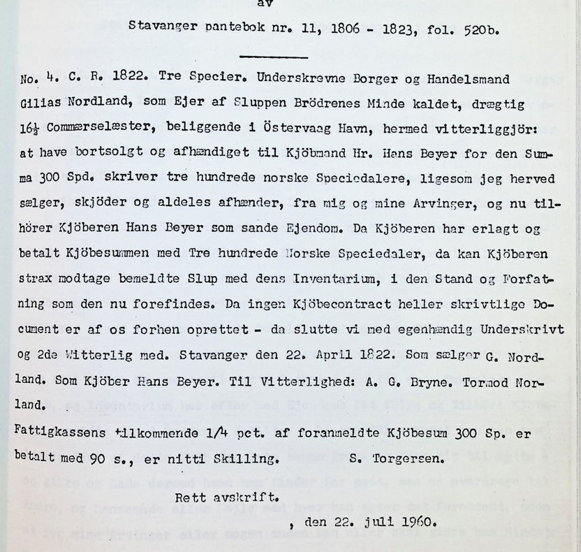 Ole christian Torstrup Skrevet 18 timer siden Del Skrevet 18 timer siden Slupen var 16,5 kommers laster. Skal være bygget i Stavanger i 1815. I 1848 kjøper Michael Berentsen denne av Chr Zetlitz. Eides da sammen med Tobias Berentsen. Sandsynligvis opphugget 1857 Kilde: Stavanger sjøfarts historie https://www.nb.no/items/f91e122f77ac580fd5aa0a549394af6c?page=201&searchText="michael berentsen" G. Norland selger til Hans Beyer i 1822 ifølge vedlagte dokument. Klarer noen finne mer dokumentasjon på kjøpet i 1848, hogging i 1857 eller annen historikk? Lenke til kommentar https://forum.arkivverket.no/topic/371195-slup-br%C3%B8drene-minde/ Del på andre sider More sharing options...